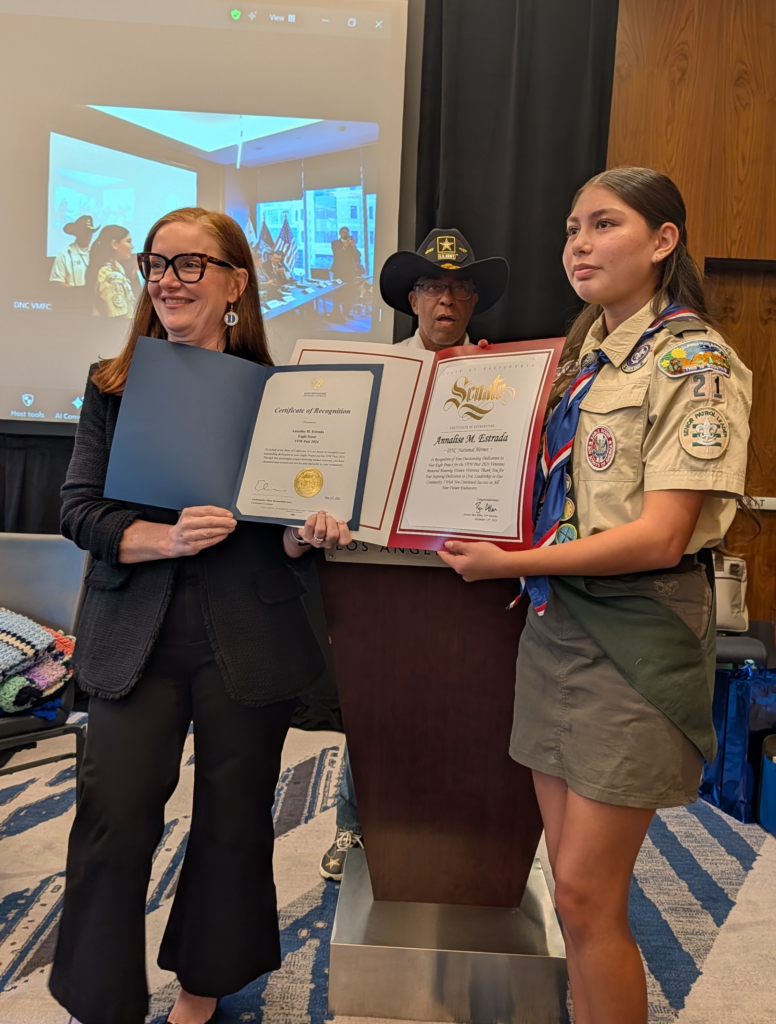 Several individuals were recognized for exceptional service. Annalisa Strada, a 13-year-old Eagle Scout, was honored for leading and self-funding a Women’s Veterans Memorial project, raising more than $10,000. Dr. Felicia Banks and California women leaders recognized Rachel Vostello, a veteran whose resilience through significant personal challenges inspired the presentation of a symbolic blanket of support. Fred was also acknowledged for his work raising awareness around Proposition 50, earning commendation from the governor.